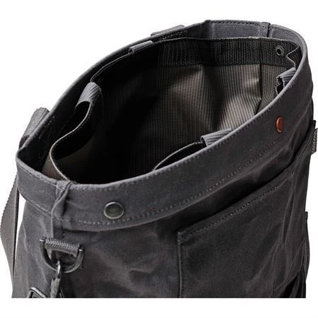 - Gray waxed canvas construction with metal hardware