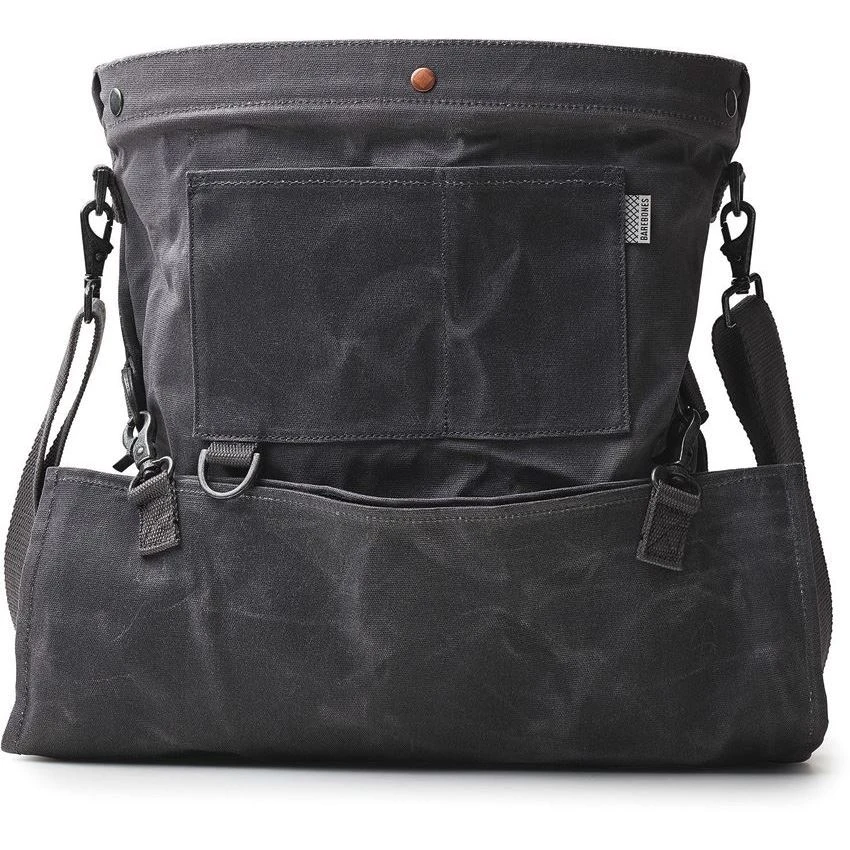 Model – BARE068. Harvest and Gathering Bag. Dimensions: 18 inch x 16.5 inch x 5 inch. Weight: 2.1lb. Gray waxed canvas construction with metal hardware. Vintage-inspired orchard design with multi-way straps. Bottom drop-out for easy unloading. Removable water tight liner. Bulk packed.