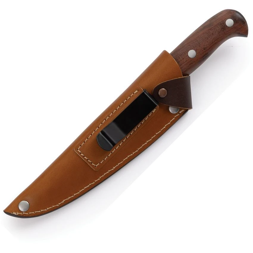 Model – BARE108. Barebones Living Adventure Paring Knife. 8″ (20.32cm) overall. 4.75″ (12.07cm) satin finish AUS-8 stainless blade. Rosewood handle. Full tang. Brown leather belt sheath. Boxed. Made in China.