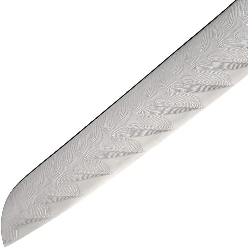 Model/Part Number – BMK126. Benchmark Bread Knife Damascus. 13″ (33.02cm) overall. 8″ (20.32cm) Damascus steel blade. Rosewood and greenwood handle. Boxed. Made in China.