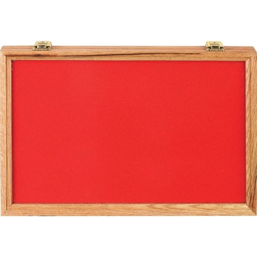 Model – M141. China Made M141 – Oak And Glass Display Case Comes with Two Keys. Measures 12″ x 18″ x 2″. Foam lined with red foam cover. Locking hinges. Comes with two keys. Proudly made in the USA.