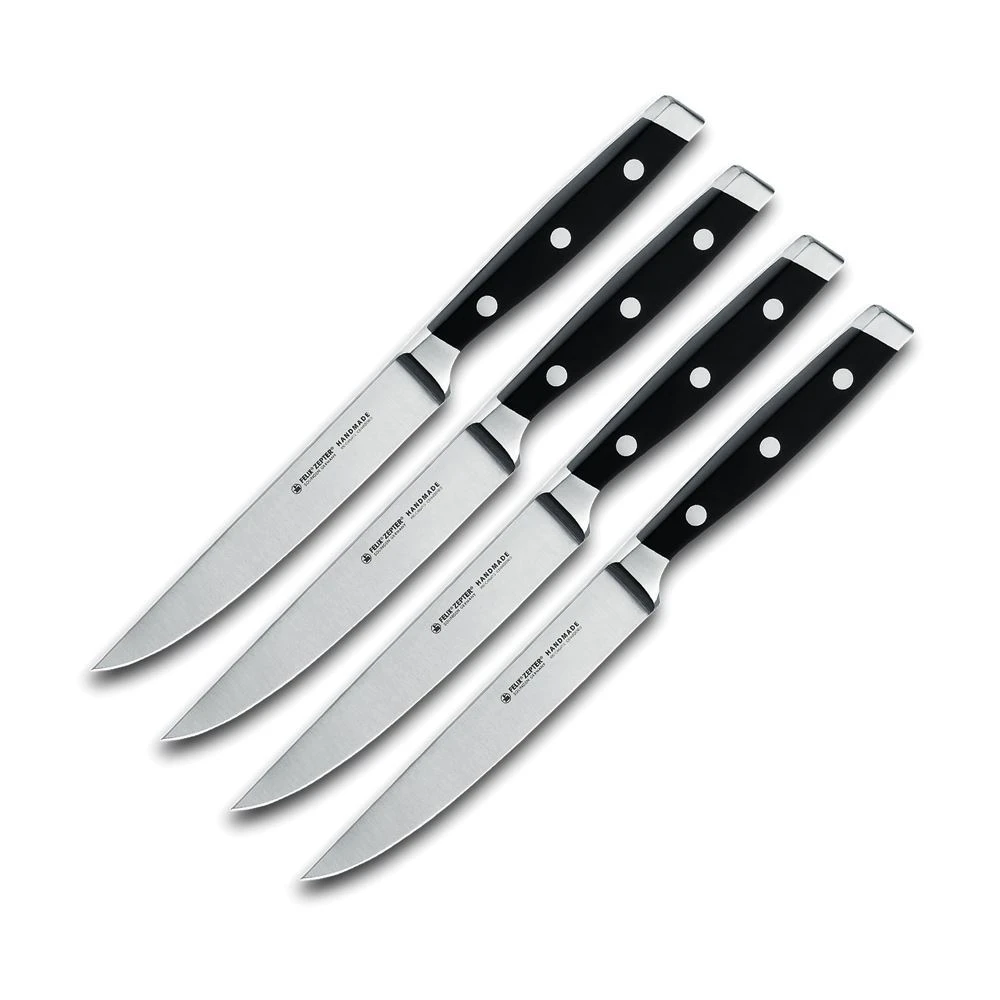 Model – FEL814604. FELIX 4pc Steak Knife Set. 9.25″ (23.5cm) overall. 5″ (12.7cm) satin finish X50CrMoV15 stainless blade. Black plastic handle. Stainless bolster(s). Stainless pommel. Boxed. Made in Germany.