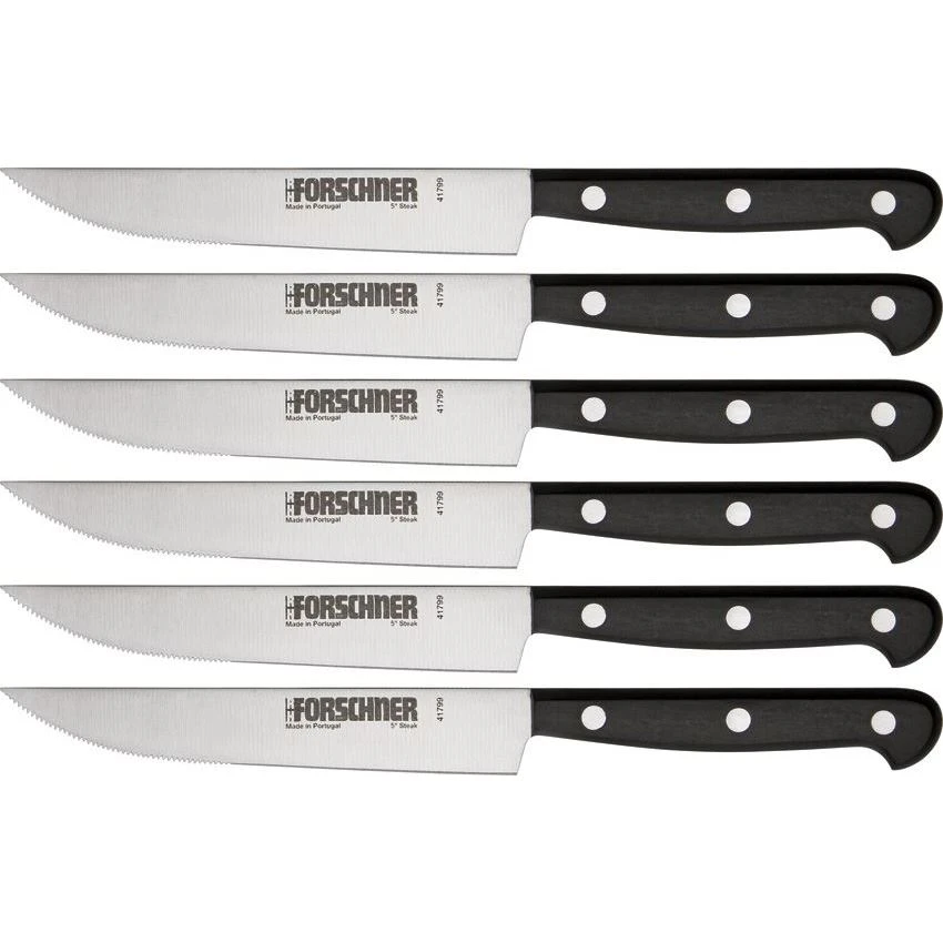 Model – VN7602961X1. Forschner 7602961X1 – 5 Inch Steak Kitchen Knife Set with Black Pom Handle. Includes six knives with 5″ blades. Black POM handle. Gift boxed. Made in Portugal.