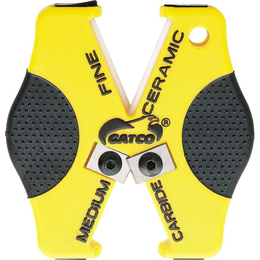 Model – GTC6402. Double Duty Sharpener. Micro-X Double Duty Sharpener. Dimensions: 2.75 inch x 2.63 inch x .38 inch. Yellow ABS handle. Medium, fine, carbide, and ceramic rods. Preset angle. Slip resistant grip. Clam packed.