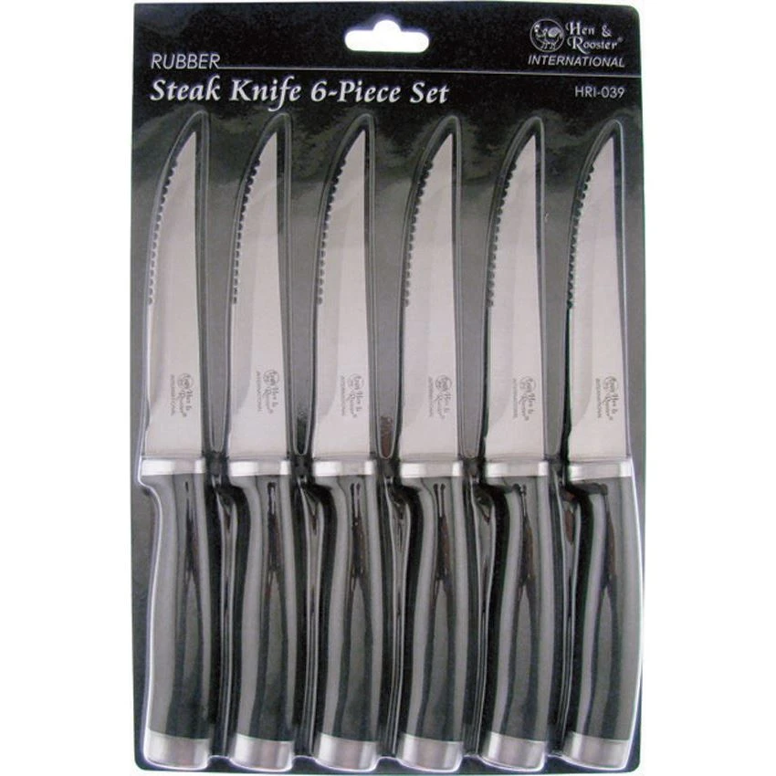 Model – HRI039. International 6 Pc Steak Set. 8.75 inch overall. 4.5 inch serrated high carbon stainless blade. Black rubberized synthetic handle. Stainless guard and pommel. Hang packaged.