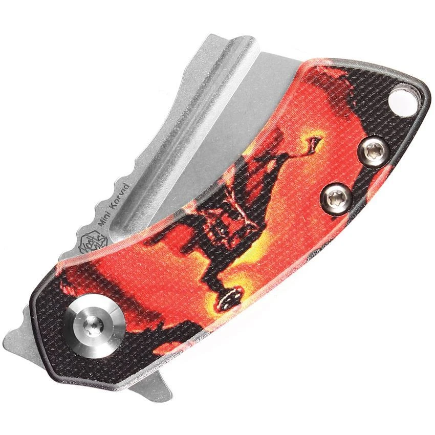 Model/Part Number – KT3030S2. Kansept Mini Korvid Horseman. 2.25″ (5.72cm) closed. 1.5″ (3.81cm) stonewash finish 154CM stainless blade. Synthetic handle. Extended tang. Pocket clip. Headless horseman print on front handle. Black nylon pouch. Boxed. Made in China.