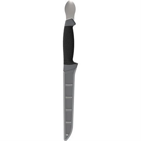 Model – KS1243SHX. Fillet with Spoon. 14.5 inch overall. 7 inch satin finish 420J2 stainless fillet blade. Black rubberized GRN handle. Stainless spoon pommel. Black plastic sheath. Hang packaged.