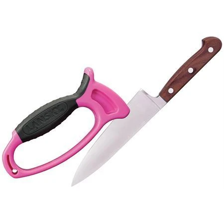 Model – LS09896. Deluxe Quick Edge with Pink Composition Handle with. Knife sharpener measures 6.38 inch overall. Pink composition handle with non-slip grip rubberized insert. Features safety thumb rest and finger guard. Ergonomic grip. Lanyard hole. Pull-thru tungsten carbide sharpeners. Sharpening angles are pre-set at 22.5¼ to achieve a 45¼ inclusive angle. Quick and easy to use. Hang packaged. Lansky Sharpeners is a proud sponsor of the National Breast Cancer Foundation, Inc. Made in China.