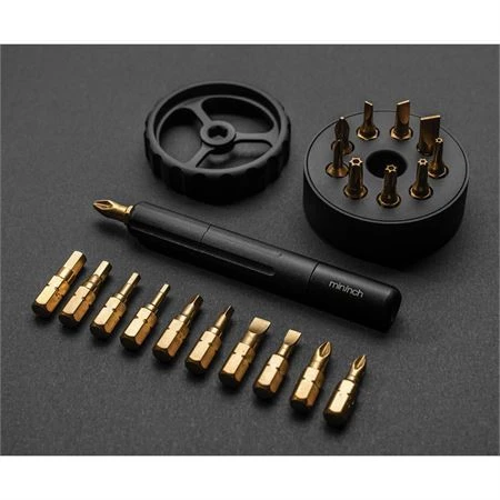 Model – MINISD006. Spinner Drive Standard Plus. Bits include: PH0; PH1; PH2; SL2.5; SL4.5; SL6.5; TR10; TR15; TR20; TR25; SL3.5; SL5.5; PZ1; PZ2; S1; S2; H2.5; H3; H4; H5. Bits are manganese phosphate coated S2 tool steel construction. Bit storage cylinder. Compact carry case. Color: Black. Boxed. Made in Taiwan.