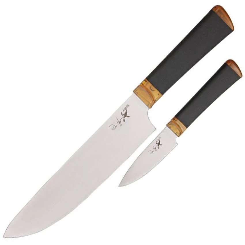 Model – ON2570. Agilite Chef & Paring Fixed Blade Knife with Transparent Handle. Set. Includes one 14.75 inch overall chef’s knife with 9.38 inch blade and one 7.5 inch overall paring knife with 3.38 inch blade. Both knives feature Sandvik 14C28N stainless blades, hardened to 57-59 HRC, full tangs and amber Ultem transparent handles with black Kraton grips. Designed by Dan Maragni. Proudly made in the USA.