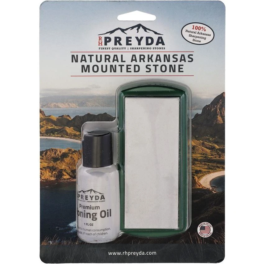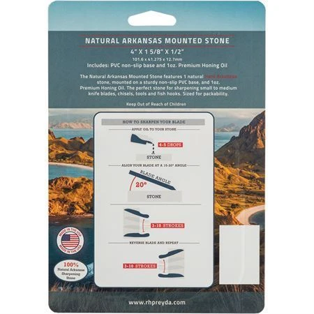 Model – RHP30998. RH Preyda 30998 – Arkansas Pocket Stone. Dimensions: 4″ x 1.63″ x 0.5″. Hard Arkansas stone with PVC non-slip base. 1 oz premium honing oil. Clam packed. Proudly made in the USA.