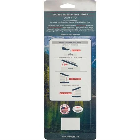 Model – RHP30999. RH Preyda 30999 – Arkansas Paddle Stone w/Oil. Dimensions: 8.25″ x 1″ x 0.75″. Stone dimensions: 4″ x 1″ x 0.25″. Double-sided: one soft Arkansas stone and one hard Arkansas stone. Wood paddle. 1 oz bottle honing oil. Clam packed. Proudly made in the USA.
