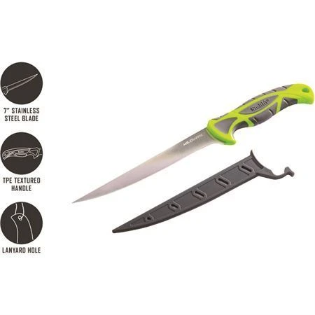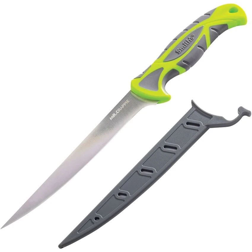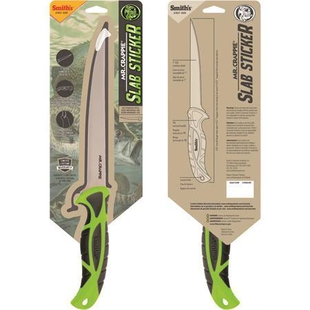 Model – AC51209. Mr. Crappie Slab Sticker. 12.5 inch (31.75cm) overall. 7 inch (17.78cm) satin finish 420 stainless blade. Green and gray TPE handle. Gray blade cover. Clam packed. Made in China.