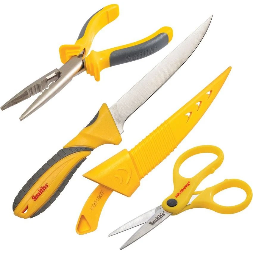 Model – AC51232. Mr. Crappie Fishing Combo. 11.5 inch (29.21cm) overall. 6 inch (15.24cm) satin finish 420 stainless blade. Gray and yellow textured TPE handle. Lanyard hole. Includes: 7.25 inch pliers with split shot crimper, side cutters ,nickel-plated carbon steel jaws, and leaf spring; 5.25 inch overall scissors with serrated cutting edge which can cut both mono and braided lines. Yellow thermoplastic belt sheath. Clam packed. Made in China.