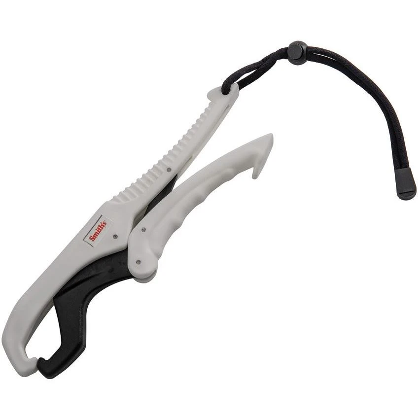Model – AC51283. Regal River Floating Fish Grip. 9.25 inch (23.5cm) overall. Gray and black non-corrosive plastic construction. Floats. Heavy duty jaws. Quick release mechanism. Wrist lanyard. Hang packaged. Made in China.
