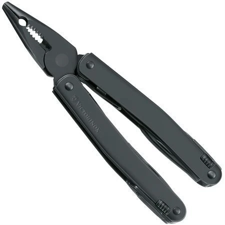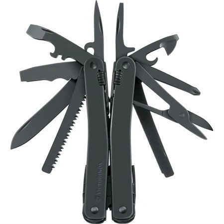 Model – VN302243CN. SwissTool Spirit Black. 4.13 inch closed. Black stainless handles. Tools include: Needlenose pliers l Wire cutter l Large blade l Phillips screwdriver l Reamer with sewing eye l Hook l Can opener l Bottle opener l Flat head screwdriver l Screwdriver tip l Small screwdriver l Pry bar l Wire crimper l Scissors l Saw blade l Wire stripper l Lanyard loop. Metal saw blade I Chisel I Metal file I Scraper I Cable cover longitudinal cutter I Cable cover crossways cutter I Coupling for corkscrew. Black nylon belt sheath. Boxed.|