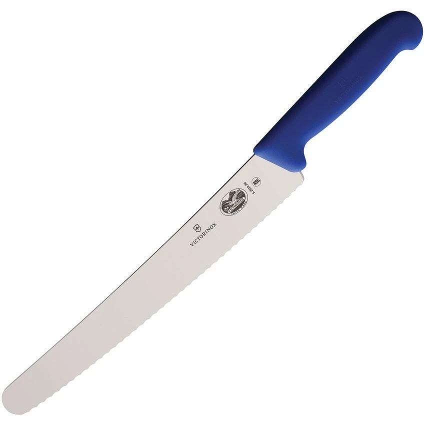 Model – VN5293226. Serrated Bread Blue. Kitchen Series. 15 inch overall. 10 inch serrated stainless blunt tip blade. Blue Fibrox handle. Dishwasher safe. Dishwasher safe. Hang packaged. Made in Switzerland.