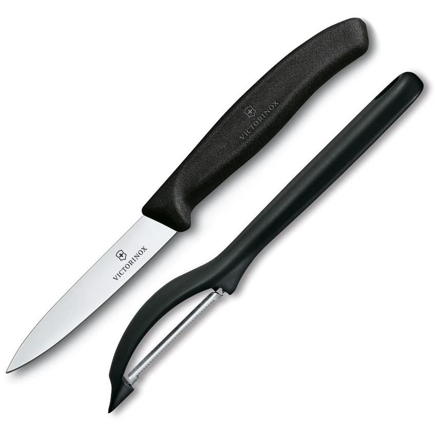 Model – VN76075X8. Swiss Army Knives 76075X8 – Pairing Knife/Peeler Combo. 7.5″ (19.05cm) overall. 3.25″ (8.26cm) satin finish stainless blade. Black polymer handle. Dishwasher safe. 8.25″ overall peeler with potato eye remover and lanyard hole. Hang packaged. Made in Switzerland.