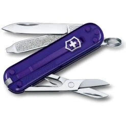 Model – VN06223T29G. Victorinox Classic SD Persian Indigo. 2.5 inch (6.35cm) closed. Translucent ABS handle. Tools include: File l Keyring l Scissors l Screwdriver tip l Small blade l Toothpick l Tweezers. Color: Persian Indigo (purple). Boxed. Made in Switzerland.