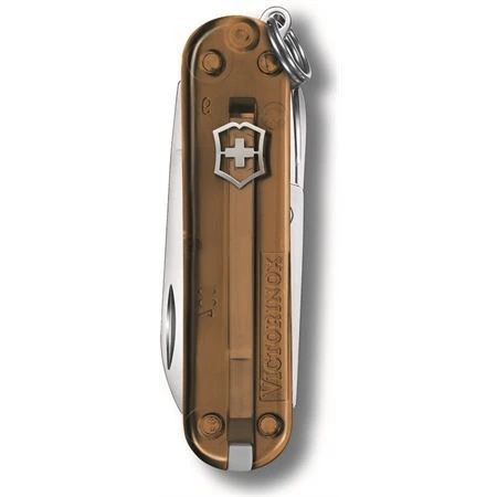 Model – VN06223T55G. Victorinox Classic SD Chocolate Fudge. 2.5 inch (6.35cm) closed. Translucent ABS handle. Tools include: File l Keyring l Scissors l Screwdriver tip l Small blade l Toothpick l Tweezers. Color: Chocolate Fudge (brown). Boxed. Made in Switzerland.
