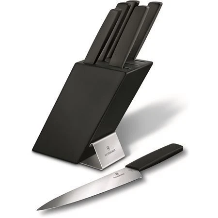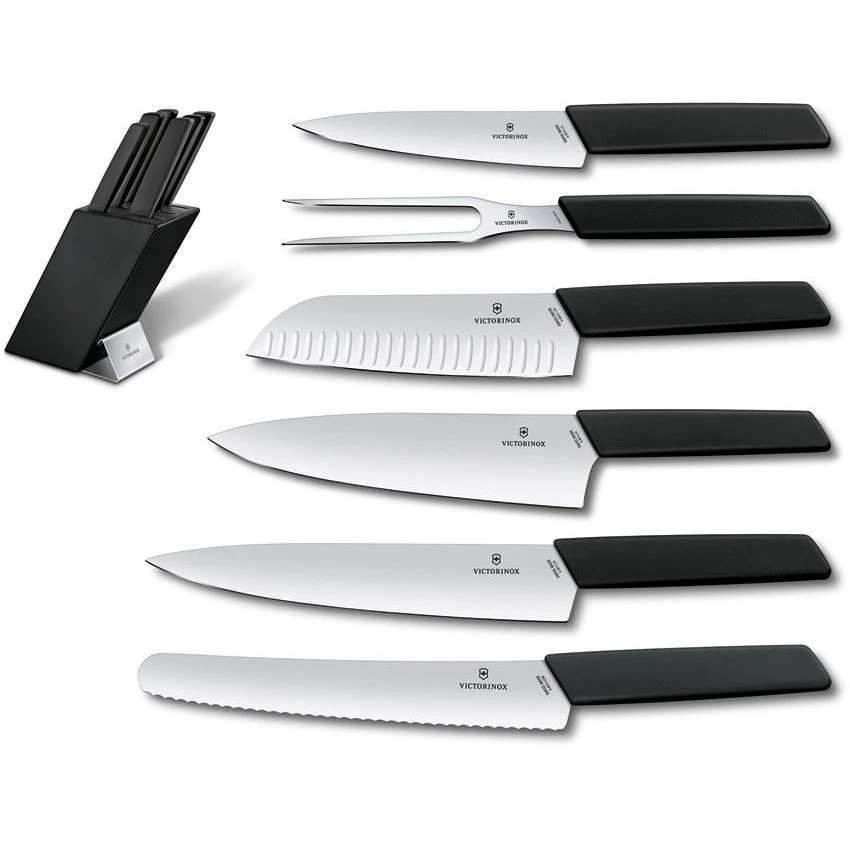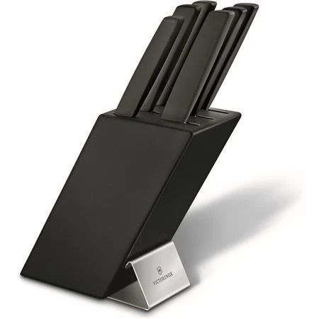 Model – VN6718663. Swiss Modern 6pc Knife Set. Stainless blade. Black synthetic handle. Includes: Bread knife with 8.63 inch blade; Carving knife with 8.63 inch blade; Carving knife with 7.88 inch wide blade; Santoku with 6.63 inch blade; Utility with 6 inch blade; Carving fork with 6 inch tines. Black beechwood storage block. Boxed. . Made in Switzerland