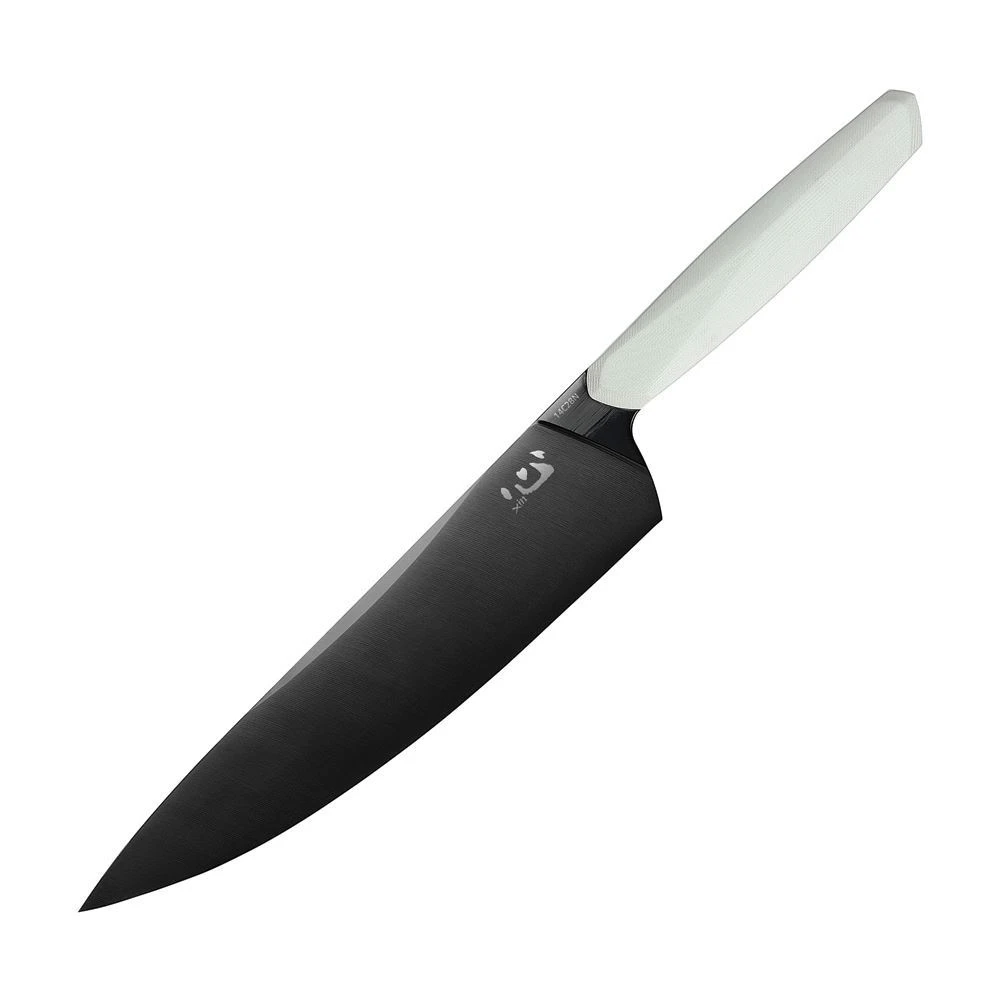 Model – XC125. Xin XinCore Chef’s Knife. 14″ (35.56cm) overall. 8.25″ (20.96cm) black TiNi coated 14C28N Sandvik stainless blade. White sculpted G10 handle. Boxed. Made in China.